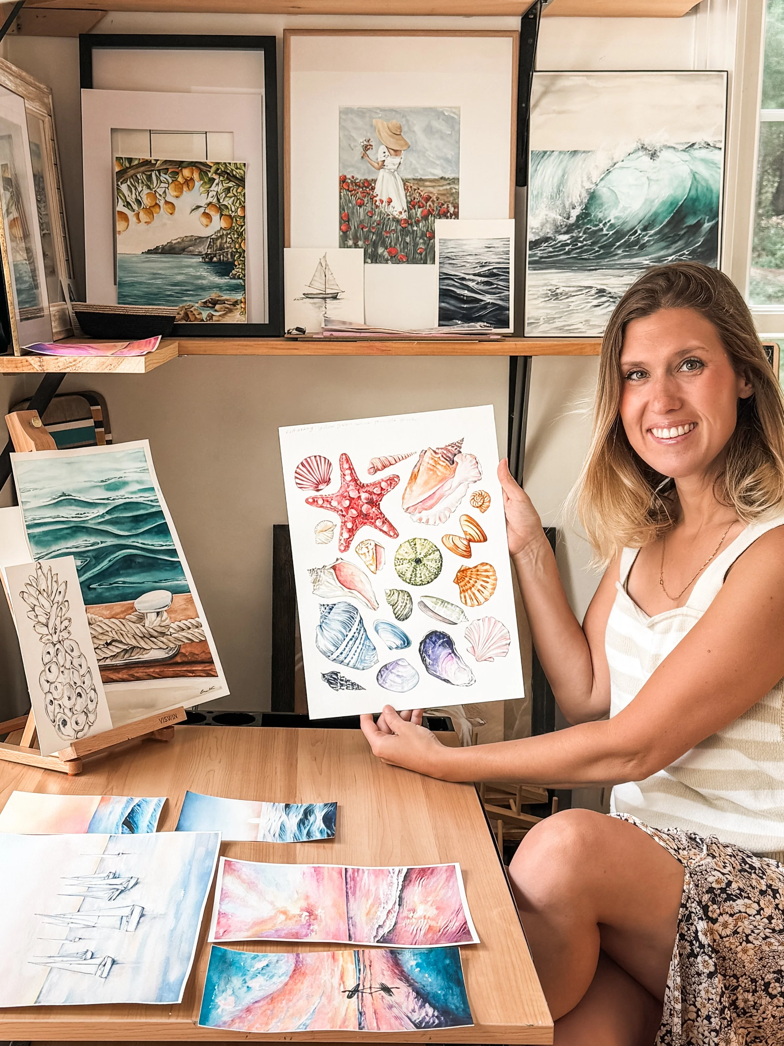 Over a decade later and thousands of watercolors painted, this has been an exciting journey of juggling being a mom and painting full time. I have since expanded from nursery watercolors to include prints and custom watercolor orders and live wedding guest painting. I find joy painting the ocean and seascapes, influenced by our life in the Rhody state.